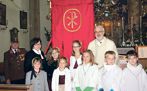 Pfarrer Mag. Klemens Pillhofer, Fahnenträger Georg Schießl, Goldhaubenobfrau Elriede Kölbl und die ganze Pfarre freut sich über die Neuanschaffung, die von verschiedenen Gruppierungen, Vereinen und Privatpersonen finanziert wurde.