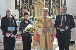 Altenfelden. „Ich bin wirklich von Herzen dankbar“, sagte Altenfeldens Pfarrer Clemens Höglinger. Mit langanhaltendem Applaus am Ende des Osterhochamts bekräftigten die Kirchenbesucher/innen die Worte ihres Pfarrers: Für fünfzig Jahre Orgeldienst wurde die pensionierte Volksschullehrerin Elisabeth Pettrich geehrt. Ihre Ausbildung erhielt sie bei Prof. Kropfreiter in St. Florian, seit 1967 ist sie in Altenfelden Organistin, sie war auch 25 Jahre als Pfarrgemeinderätin aktiv. Seit vierzig Jahren leitet OSR Reinhard Lehner (rechts) den Kirchenchor und hat ein beeindruckendes Repertoire von Messen mit Chor und Orchester einstudiert. Am Ostersonntag wurde die Nicolaimesse von J. Haydn aufgeführt. Lehner hat den Dienst des Chorleiters 1977 von seinem Vater Emmerich übernommen.