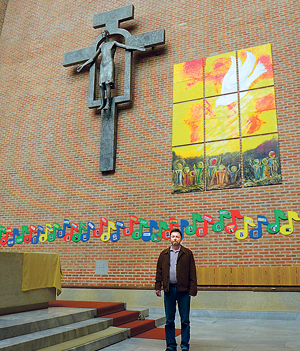 Zurück zur Kirche, dem unübersehbaren, zweiten Wahrzeichen von Lenzing – neben dem mächtigen Soleturm der „Fabrik“. Rund 150 Leute kommen am Sonntag zum Gottesdienst, die Pfarre zählt etwas über 2000 Katholiken. Pfarrer Ortner schmunzelt: Die insgesamt 225 Laufmeter Sitzbänke bieten für jeden Einzelnen genügend Platz. Er und die gesamte Pfarre bemühen sich sehr um eine ansprechende Liturgie und Gestaltung der „Heilig-Geist-Kirche“. Erst kürzlich haben die Firmlinge für die mächtige Altarwand unter Anleitung der heimischen Künstlerin Anna Weinberger und einigen Helfern ein „Heilig-Geist-Mosaik“ geschaffen (siehe Bild). Den Geburtstag seiner Pfarrkirche feiert Lenzing am Pfingstsonntag, 19. Mai 2013 nach dem Gottesdienst mit einem Frühlingsfest.