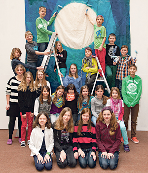 „Die leuchtenden Farben des Tuchs ziehen jeden in den Bann. – Es sieht aus wie das Wasser des Lebens.“ So sieht Jasmin, eine der Schüler/innen der Musikhauptschule Eggelsberg das gemeinsame Werk der 2a-Klasse: ein Fastentuch für die Pfarrkirche.