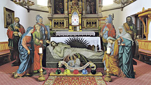 In der lange nicht beachteten Hinterlassenschaft der Franziskanerbrüder, die bis 1992 fast 110 Jahre lang Seelsorger in der Pfarre Bruckmühl waren, fand sich ein altes „Heiliges Grab“. Die auf Holz gemalte, lebensgroße Figurengruppe, bestehend aus Leichnam Jesu, Maria, Johannes, Maria Magdalena, römischen Soldaten und den Propheten Jesaja und Jeremia, wurde renoviert und bildet nun bereits das zweite Jahr das Zentrum der Karfreitagsliturgie. Der Chor gestaltet die Liturgie am 14. April um 19 Uhr mit Passionsliedern aus dem Alpenraum sowie Chorwerken von Hermann Kronsteiner, Franz X. Müller und Anton Reinthaler mit.
