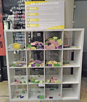 Im Einkaufszentrum Plus City hat die Jugendseelsorgerin Maria Magdalena Frauscher eine „Ab-Ladestation“ errichtet. Die Passanten sind eingeladen, das, was sie belastet, auf Zettel zu schreiben und diese in ein Regal einzuwerfen. Die Sorgen-Zettel werden in der Osternacht in der nahen Pfarrkirche Langholzfeld verbrannt.