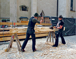 Nach 450 Jahren müssen Teile des Dachstuhls ausgetauscht werden, um die gotische Kirche vor Schäden zu bewahren. Die Handwerker bedienen sich dabei zum großen Teil jener Techniken, die schon die Erbauer eingesetzt haben. Aus der Menge des damals verwendeten Holzes könnten heute 50 bis 100 Einfamilienhäuser errichtet werden, erzählte der Restaurator und Zimmerer Vinzenz Baumann am vergangenen Donnerstag, als der dreigeschossige Dachstuhl für Medienvertreter/innen geöffnet wurde. Die Arbeiten werden von Land, Stadt, Bund, Diözese und Pfarre finanziert und sollen im Herbst abgeschlossen sein. Dann folgt die Kirchenrestaurierung.