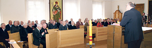 Priester sollten sich „von allzu perfektionistischen Vorstellungen verabschieden“. Diesen Rat erteilte der Kärntner Bischof Alois Schwarz (am Pult) den rund 50 Seelsorger/innen, die zum 44. bayerisch-österreichischen Seelsorger-Treffen ins Stift Reichersberg gekommen waren. Der Bischof sprach sich für eine „Konzentration der Kräfte und gegenseitige Bestärkung in der Seelsorge“ aus. Er erinnerte an die Eröffnungsrede von Johannes XXIII. beim Zweiten Vatikanischen Konzil, als der Papst die Priester aufrief, „freudig und furchtlos ans Werk zu gehen“.