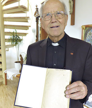 Schloss Riedegg. Das Buch selbst, ein Predigthandbuch aus dem Jahr 1939, ist wertlos und ein Fall für den Flohmarkt, würde sich nicht der Name seines Besitzers drinnen finden. Die Predigthilfe, die P. Bernhard Pagitsch CMM (im Bild) in den Händen hält, gehörte dem NS-Martyrer P. Engelmar Unzeitig CMM (1911–1945) und stand bis vor wenigen Tagen – unentdeckt – in der Bibliothek der Mariannhiller Missionare auf Schloss Riedegg. Im Zuge der Nachkriegswirren kam das Buch von P. Engelmars Pfarre Glöckelberg ins Provinzhaus seines Ordens. Da von P. Engelmar, der 2016 als „Engel von Dachau“ seliggesprochen wurde, außer seinem Messkelch nur wenige persönliche Gegenstände erhalten sind, ist das nun gefundene Buch für seine Ordensgemeinschaft ein wertvolles Stück.