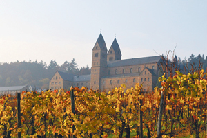 „Da hinten steht Hildegard!“ – Kurt Brühl deutet auf den Müsli-Tisch des Frühstücksbuffets. „Jeden Tag fünf Mandeln hat die Hildegard gesagt, das hält den Geist fit“. Der fröhliche Hotelchef weiß abends, wie er seine Hotelgäste mit guter Laune unterhält. „Die meisten Leute wissen ja gar nicht, dass die Hildegard nicht in Bingen liegt, sondern hier bei uns in Rüdesheim.“ Mit „bei uns“ meint er die Pfarrkiche im Rüdesheimer Stadtteil Eibingen. Dort steht der Schrein der bekanntesten mittelalterlichen Heiligen. Nur ein paar hundert Meter weiter hinauf durch die Weinberge leben 51 Benediktinerinnen im Kloster St. Hildegard.