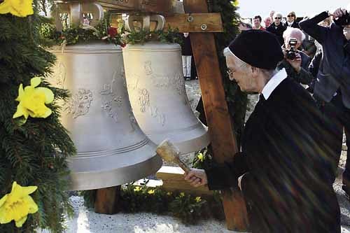 Seelsorgezentrum Lichtenberg. An die 500 Lichtenberger/innen und Gäste waren am 9. April 2011 zur Feier der Glockenweihe mit Bischof Maximilian Aichern gekommen. In seiner Predigt bezeichnete er die Glocken als „Botinnen der Freude“, die nicht nur einen schönen Klang verbreiten, sondern auch die Botschaft von der Nähe Gottes verkünden werden. Die drei Glocken des Seelsorgezentrums sind den drei großen Herausforderungen gewidmet, die aufzugreifen sich die christlichen Kirchen in ihrem konziliaren Prozess verpflichtet haben: dem Frieden, der Gerechtigkeit und der Bewahrung der Schöpfung. Die Leiterin des Fachausschusses Caritas, Sr. Anastasia Felbauer (im Bild), schlägt zum ersten Mal die Gerechtigkeitsglocke an, die gleichzeitig der Caritasheiligen Elisabeth von Thüringen geweiht ist. Gegossen wurden die Glocken von der Firma Grassmayr und künstlerisch gestaltet von Judith P. Fischer aus Wien.
