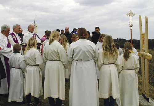 Niederthalheim. Einen ganz besonderen Kreuzweg erarbeiteten die Kinder der vierten Klasse der Volksschule. Auf sieben Bildern stellen sie mit Glasmosaiken (kl. Foto) das Leiden Jesu Christi dar. In der Glashütte Schwanenstadt stand den Schülerinnen und Schülern eine Künstlerin zur Seite, die ihnen bei der Auswahl der farbigen Glaselemente half. Dann wurden die Bilder gebrannt. Zahlreiche Gläubige kamen am 20. März zur Segnung des Kreuzweges. Pfarrer Hermann Pachinger und die Diakone Alois Mairinger und Wolfgang Kumpfmüller segneten die Kreuzwegstationen und dankten allen Beteiligten. „Das Kreuz begleitet unser Leben“, sagte Pachinger.