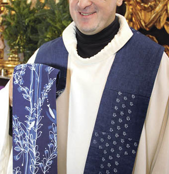 Gutau. Das Team des Färbermuseums Gutau fertigte eine Stola in traditionellem Mühlviertler Blaudruck an und machte sie Pfarrer Manfred Wageneder zum Geschenk. Die dafür notwendigen Blaudruckstoffe wurden von den beiden letzten Blaudruckfärbern Österreichs hergestellt. Eine Seite der Stola ist aus Leinen aus einer Weberei in Helfenberg im Mühlviertel, gefärbt und mit heimischen Modeln, verziert von der Färberei Wagner aus Bad Leonfelden. Die andere Seite besteht aus Seide, verziert mit modernen sakralen Elementen von der akademischen Malerin Miriam Schwak und mit Indigo gefärbt von der Blaufärberei Koó aus dem Mittelburgenland. Die von den Führe-rinnen des Färbermuseums Gutau in Handarbeit kunstvoll genähte Stola verbindet so moderne Kunst mit bodenständigem, jahrhundertealten Modeldruck und Seide aus dem Orient mit Leinen aus dem Mühlviertel. Der Pfarrer freute sich über die nicht alltägliche Stola und trägt das Unikat gerne bei Marienfesttagen. Blau gilt als Farbe der Reinheit und kann als liturgische Farbe bei Marienfesten verwendet werden.