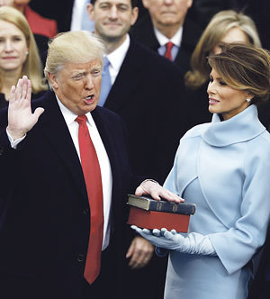 Donald Trump ist am Freitag zum 45. Präsidenten der Vereinigten Staaten von Amerika vereidigt worden. Mit der linken Hand auf seiner eigenen und der historischen Bibel Abraham Lincolns und die Rechte zum Schwur erhoben, sprach er die protokollarischen Worte: „So wahr mir Gott helfe.“ Schon am frühen Morgen hatte Trump mit einer Überraschung aufgewartet, als in der sogenannten Präsidentenkirche St. John nicht der heimische Geistliche, sondern der Baptistenpfarrer Robert Jeffress aus Dallas/Texas die Predigt hielt. Jeffress war mehrfach durch diskriminierende Äußerungen über Schwarze, Muslime und Homosexuelle aufgefallen. Während Papst Franziskus zu Besonnenheit und zum Abwarten riet, reagierten deutsche Bischöfe besorgt auf den Amtsantritt. Der Kölner Kardinal Rainer Maria Woelki etwa äußerte sich kritisch zu Trumps Machtgebaren. Der katholische Bischof von Hildesheim, Norbert Trelle, war nach eigenem Bekunden „betroffen und entsetzt“ von Trumps erster Rede nach der Amtseinführung. Vor allem die Botschaft „Amerika zuerst“ mache ihm Sorgen, sagte Trelle.