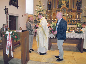 Traberg. 1980 hat Maria Rehberger (links) mit dem Kirchenschmücken begonnen. Über 36 Jahre hat sie mit Hingabe diesen Dienst verrichtet. Nun übergibt sie das Kirchenschmücken in die Verantwortung von Regina Atzmüller-Tumfart und ihrem Team. Nach dem Gottesdienst am 6. Jänner 2017 dankte Pfarrer P. Wolfgang Haudum OCist (Mitte) und PGR-Obmann Erwin Mayrhofer (rechts) Maria Rehberger für ihren jahrzehntelangen Einsatz. Die ganze Pfarrgemeinde schloss sich mit einem langen Applaus an. privat