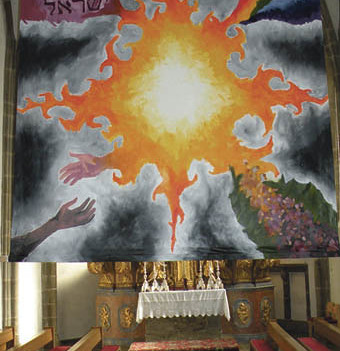 Pabneukirchen. Die Horterzieherin Veronika Payreder hat für die Pfarre Pabneukirchen ein Fastentuch gestaltet, das seit Aschermittwoch den Gottes-dienstbesucher/innen vor Augen steht. In ihrem drei mal drei Meter großen Werk verarbeitete sie die Themen der Sonntagslesungen. Das Zentrum des Fasten-tuchs bildet eine helle Fläche, die an den brennenden Dornbusch erinnert, wo Gott seinen Namen geoffenbart hat: „Jahwe, der ich bin, der ich bin da.“ Man kann auch ein leuchtendes Kreuz darin sehen, das den leidenden und auferstandenen Christus symbolisiert, oder das Feuer des Heiligen Geistes.