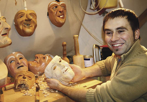 Es ist einer der Höhepunkte des Faschings: der Fetzenzug, der am Rosenmontag, 15. Februar in Ebensee über die Bühne geht und bei dem der ganze Ort Kopf steht. Die Ebenseer „Fetzen“ tragen alte, verschlissene Kleidungsstücke, einen Regenschirm und kunstvolle Holzmasken. Einer der Ebenseer Maskenschnitzer ist Bernhard Dygruber (Bild). Der gelernte Mechaniker hat vor zehn Jahren seine Liebe zur Schnitzerei entdeckt. „Ich bin fast ein Saisonschnitzer“, sagt Dygruber, „weil ich vorwiegend Masken schnitze.“ Vor den Feiertagen verbringt der 33-Jährige unzählige Stunden in seiner Werkstatt. Aus einem Stück Lindenholz entstehen lustige, nachdenkliche oder zynische Gesichter. Jede der Masken ist für sich ein kleines Kunstwerk.