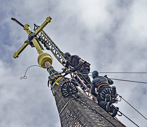 Natternbach. Bei der Besichtigung des Natternbacher Pfarrkirchturms wurden schwere Mängel am Turmhelm festgestellt, welche umgehend repariert werden mussten. Das Turmkreuz wurde ebenso neu gestaltet. Kürzlich fand die feierliche Turmkreuzsteckung statt. Ein Spektakel, das es zuletzt vor 60 Jahren in Natternbach gegeben hat. Die beiden Profis der Spezialfirma Pondorfer aus Osttirol steckten das zwei Meter hohe, vergoldete Turmkreuz in 45 Meter Höhe unter Applaus von Hunderten Zuschauer/innen auf den Kirchturm.