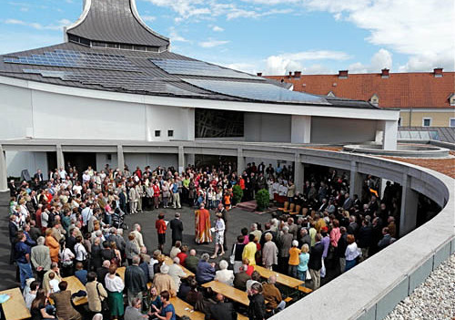 Linz-St. Konrad. Am 7. Juni eröffnete die Pfarre Linz-St. Konrad mit einem großen Pfarrfest ihren neu gestalteten Kirchenplatz. Zwischen den beiden Sonntagsgottesdiensten fand die Segnung des Kirchenplatzes und der Kindergartenspielfläche statt. Die beiden Feiern standen ganz im Zeichen des Linz09-Projektes Sonntag-Morgen. Das passende Leitwort dazu: „Die Vielfalt schätzen, die Einheit stärken“. Der Platz soll die Öffnung der Kirche, die einladend ist und nicht aus- und abgrenzt, symbolisieren. Beim Frühschoppen wurde der Kirchenplatz richtig belebt, denn fast 600 Mahlzeiten wurden an diesem Tag ausgeteilt.