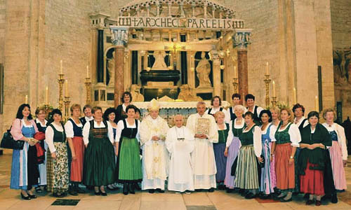 Im Rahmen ihrer Mittelmeerkreuzfahrt gingen vergangene Woche 1000 oberösterreichische Goldhaubenfrauen in der süditalienischen Hafenstadt Bari von Bord, um in der Kirche des heiligen Nikolaus mit Bischof Maximilian Aichern Gottesdienst zu feiern. Der Bischof ging in der Predigt auf das Symbol „Gold“ ein. Er hob hervor, dass nicht nur die goldene Kopfbedeckung, sondern auch das soziale Engagement den Bischof von Myra und die anwesenden Frauen verbindet. Er rief sie zur Dankbarkeit Gott gegenüber auf: „Seine Liebe ist wie das Gold, nicht nur auf dem Altar, sondern auch in unserem Leben.“ Ausdrücklich dankte Bischof Aichern den Goldhaubenfrauen für die finanzielle Unterstützung von caritativen Projekten sowie kirchlichen Bau- und Renovierungsmaßnahmen. Landesobfrau Martina Pühringer betonte die gut funktionierende Gemeinschaft der Goldhauben-, Kopftuch- und Hutgruppen mit den Schwerpunkten engagierte caritative Tätigkeit, gelebtes Brauchtum und lebendige Tracht.