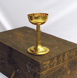 Bei der Messfeier in Dachau wird der Kelch verwendet werden, den der Pfarrer von Steinerkirchen am Innbach, Heinrich Steiner nach der Befreiung des Lagers mit einem Leiterwagen mitgenommen hatte. Das Bild zeigt diesen Kelch mit dem Messkoffer.