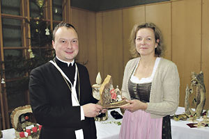 Kirchdorf am Inn. Bei der Krippenausstellung der Goldhaubenfrauen kaufte auch H. Markus Grasl, Propst vom Stift Reichersberg und Pfarradministrator, eine Krippe (im Bild mit Maria Floß). Auf großes Interesse stießen die Krippen der Kindergartenkinder, die Kindergartenleiterin Gerti Schöppl mit ihnen angefertigt hatte. Die Szene der Geburt Jesu wurde in ein verziertes „Einsiedeglas“ eingebaut.