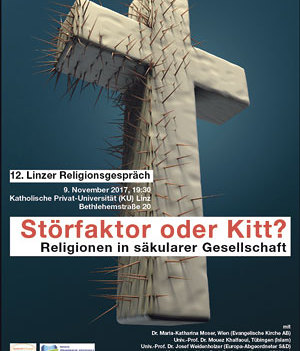 Das Verhältnis von säkularer Gesellschaft und öffentlicher Religion ist in Bewegung. Es wird in den Medien, in der Politik, in der Bevölkerung und in den Religionsgemeinschaften kontrovers diskutiert. Die Vortragenden beim 12. Linzer Religionsgespräch behandeln dieses spannende Thema aus christlicher, muslimischer und (gesellschafts-)politischer Perspektive. Mit Dr. Maria-Katharina Moser, Wien (evangelische Kirche A. B. ), Prof. Dr. Mouez Khalfaoui, Tübingen (Islam) und Univ.-Prof. Dr. Josef Weidenholzer, Brüssel (Politik). Moderation: Univ.-Prof. Dr. Ansgar Kreutzer (KU Linz). Im Anschluss Beisammensein bei Getränken und Brot. Do., 9. November 2017, 19.30 Uhr, Katholische Universität (KU) Linz, Bethlehemstraße 20