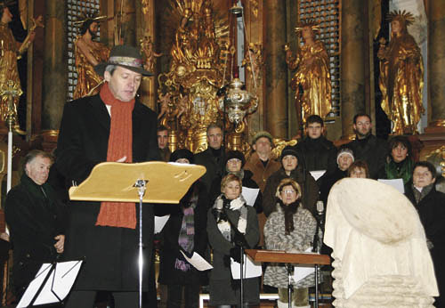 Aistersheim. Die Inszenierung des Weihnachtsevangeliums, bei dem ganz Aisters-heim zur Bühne und fast jeder Zweite der 700 Bewohner zum Akteur wurde, war ein voller Erfolg. Unter anderem trug die Pfarre mit dem Kirchenchor zu dem stimmungsvollen Abend bei. Mehr als 1.600 Besucher/innen machten sich bei den beiden Aufführungen am 29. und 30. November 2008 auf den über zweistündigen „Weg nach Bethlehem“. Höhepunkt des Schauspiels war das Ankommen bei der Krippe – aufgestellt im Altarraum der Pfarrkirche (siehe Bild).