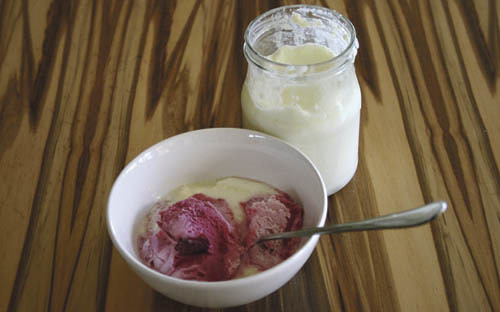 Die Milch dafür kauft man am besten beim Milchbauern in der Nähe. Dann ist die Milch nämlich nicht entrahmt oder homogenisiert und das ist das Geheimnis des eigenen Geschmackes des Joghurts. Man braucht so viel Milch, wie man später Joghurt haben möchte. Und noch einen Becher fertiges Joghurt (wegen der Bakterien). Profis verwenden eine spezielle Joghurtkultur. Die Milch wird zehn Minuten auf 90 Grad erhitzt. Zum Ausprobieren geht das ohne Thermometer. Die Milch muss so heiß sein, dass sie gerade nicht kocht (also keine Bläschen aufsteigen). Danach wird sie auf 50 Grad abgekühlt (Kochtopf in kaltes Wasser stellen). 50 Grad fühlt sich eher noch heiß an – kontrollieren kann man das am Wasserbad. Dann das Joghurt durchrühren und in die Milch rühren (mindestens 2,5 %). In Gläser füllen und „brüten“ (Wolldecke, in die Sonne stellen oder Backrohr nach Kuchenbacken nutzen – darf nicht mehr heiß sein!). Nach etwa fünf Stunden ist das Joghurt fertig. Dann muss es nur noch gekühlt werden.