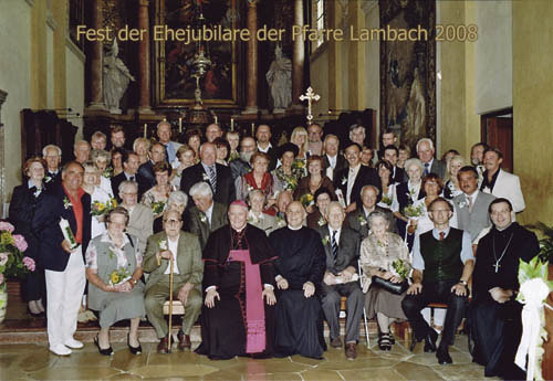 Lambach. 27 Ehepaare feierten in Lambach im Rahmen der Pfarrvisitation Jubelhochzeit. Bischof Ludwig Schwarz , Pfarrer P. Pius Hellmair und Abt Maximilian Neulinger gratulierten und stellten sich mit den Paaren dem Fotografen. Oswald und Frieda Lang sind schon seit 65 Jahren verheiratet (vorne rechts). Zwei Paare feierten 60-jähriges, sechs Paare 50-jähriges, sieben Paare 40-jähriges und elf Paare 25-jähriges Jubiläum.
