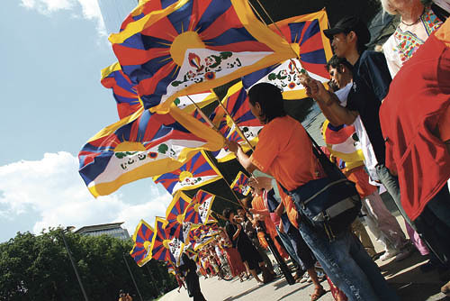 Bunte tibetische Fahnen schwenkend und religiöse Lieder singend zogen am Samstag, 28. Juni, Tibeter aus Österreich und der Schweiz durch Linz. In ihrer Rede rief Tseten Zöchbauer, die Präsidentin der tibetischen Gemeinschaft Österreich, auf, auf Produkte von Olympia-Sponsoren zu verzichten. Denn hinter der Bühne der Olympischen Spiele in China sterben Tibeter. In Petitionen wandten sich Teilnehmer/innen an Olympia-Athleten mit der Bitte, zum Zeichen des gewaltfreien Protestes weiße Schals bei den Olympischen Spielen zu tragen.