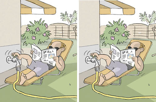 Spielen Sie mit: Finden Sie die sechs „Fehler“ und schicken Sie uns die Lösung – am besten, indem Sie die Bilder ausschneiden und die Fehler markieren. Wir verlosen die Originalkarikatur, signiert von Lois Jesner.