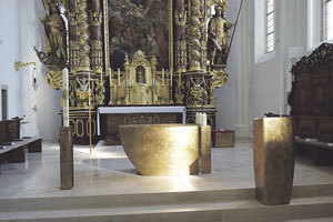 Ein halbes Jahr lang mussten die Vöcklamarkter auf ihre Pfarrkirche verzichten. In dieser Zeit tauschten die Handwerker die alten Elektroleitungen aus und betonierten den Boden im Altarraum neu. Das gotische Kreuzrippengewölbe in dem „Vöckladom“ genannten Gotteshaus wurde ebenso restauriert. Nach der Sanierung der Raumschale erstrahlt der Kirchenraum wieder in sauberem Weiß, wodurch der gotische Höhendrang des Hauptschiffs nun noch besser zur Geltung kommt. An der krönenden Spitze der Renovierung stand aber die Neugestaltung des Altarraums. Zum Erntedankfest am 2. Oktober mit Bischof Manfred Scheuer wurde nun der Abschluss der Arbeiten gefeiert. „Dieser Raum sei Nahrung für eure Seele“, sagte der Bischof in seiner Predigt.