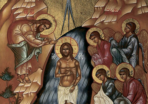 „Bei Deiner Taufe im Jordan, Herr, wurde die anbetungswürdige Dreifaltigkeit geoffenbart. Denn des Vaters Stimme zeugte für Dich, da sie Dich nannte den geliebten Sohn, und der Geist in Gestalt einer Taube bekräftigte die Gewissheit des Wortes. Christus, Gott, der erschien und die Welt erleuchtet, Ehre sei Dir!“(Hymnus der orthodoxen Kirche zum Fest Epiphanie – Erscheinung des Herrn) Wir sehen auf der Ikone den menschgewordenen Sohn Gottes, stehend in den Fluten des Jordans. Der heilige Johannes der Vorläufer und Täufer beugt sich, um Jesus zu taufen. Ehrfurchtsvoll stehen vier Engel dabei, mit verdeckten Händen.