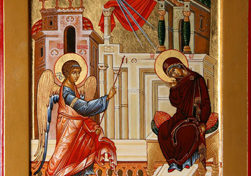 „Heute ist der Anfang unserer Erlösung und die Offenbarung des Geheimnisses von Ewigkeit her: Gottes Sohn erscheint als Sohn der Jungfrau . . . deshalb rufen auch wir der Gottesgebärerin zu: Freue Dich, Du Gnadenvolle, der Herr ist mit Dir.“ (orthodoxer Hymnus zum Fest der Verkündigung des Herrn)Ein neues Licht geht auf, das göttliche Licht nimmt Menschengestalt an. Anfänglich erschrickt Maria, als der Erzengel Gabriel zu ihr spricht: „Sei gegrüßt, Gnadenvolle, der Herr ist mit dir . . .“ Durch Marias „mir geschehe nach deinem Wort“ wird Gott Mensch. Dieses Freudenlicht der göttlichen Menschwerdung erstrahlt in dieser Ikone. Wir sehen Gabriel, in großer Eile schreitet er auf die Gottesmutter zu. Auf vielen Ikonen ist er mit blau-grünen Gewändern bekleidet. Engel als Geschöpfe Gottes sind mit einem blauen Untergewand bekleidet, der Farbe der Schöpfung. Als Überbringer des Lebens trägt er ein grünes Obergewand. Vom Thron Gottes kommend trägt er ein strahlend rotes Obergewand, das das Feuer des göttlichen Thrones widerspiegelt. Mit gehobener rechter Hand – der hellenistische Redegestus ist zur Segenshand gewandelt – spricht er die Gottesmutter an. In seiner linken Hand hält er einen Stab, der ihn als Boten ausweist. Maria sitzt auf einem erhöhten Thron, sie ist damit als höher ausgewiesen als die Engel, wie es ein Hymnus ausdrückt: „Wahrhaft würdig ist es, Dich selig zu preisen, Gottesgebärerin, allzeit selige und makellose und Mutter unseres Gottes! Geehrter als die Cherubim und unvergleichlich herrlicher als die Seraphim, unversehrt hast Du das göttliche Wort geboren: Du wahrhaft Gottesgebärerin, sei hochgepriesen!“