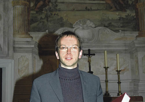 Vikar Hannes Dämon in der Prunerstiftkirche der altkatholischen Kirchengemeinde. Das Hochaltarbild der 1738 geweihten Kirche zeigt die „Epiphanie“ (Erscheinung des Herrn) und wird Martino Altomonte zugeschrieben.