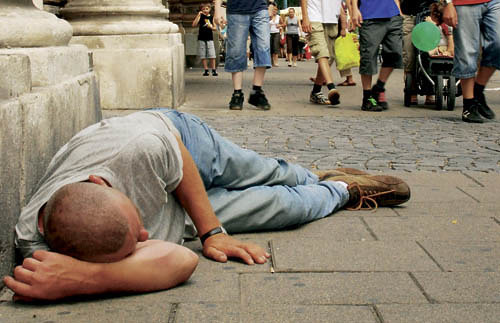 Mitten in der Mariahilfer-Straße. Mitten im Juli. Bei 38 Grad. Zu heiß, um einzukaufen. Zu teuer, um in einem der Straßencafés etwas zu trinken. Trotzdem sind sie alle voll. Die Geschäfte ebenso wie auch die Cafés. Einer Anklage kommt er entgegen, dieser Körper, der mitten unter den Menschen liegt. Natürlich habe ich keine Ahnung, weshalb er hier liegt. Meine Phantasien gehen nicht weit dabei. Höchstens bis zur Betrunkenheit. Und dann ahne ich, was es heißt, seinem Herzen zu folgen. Nicht vorbeigehen. Rütteln. Auf den Atem achten. All das weiß ich.