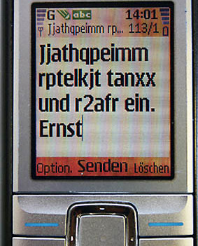 Auf die Ziffern-Tasten von 2 bis 0 sind jeweils mehrere Buchstaben des Alphabets gelegt. Auf die Taste 2 zum Beispiel a, b und c. Sie werden durch unterschiedlich häufiges Hintereinander-Antippen der Taste abgerufen. Dabei ist es wichtig, zwischen zwei aufeinander folgenden Buchstaben, wenn sie auf der gleichen Taste liegen, beim Tippen eine kleine Rast einzulegen, sonst kommt ein Kauderwelsch heraus. Und es ist wichtig, zielstrebig weiterzutippen, um einen hinteren Buchstaben tatsächlich zu erreichen.Zur Veranschaulichung: Die Buchstaben M, N, O liegen auf der 6er-Taste. Mit Einmal-Drücken schickt man M auf die Reise; drückt man zweimal, löst sich N; und drückt man dreimal, kommt das O. Das Wort „Mond“ ist daher so zu bilden: einmal 6 – rasten – dreimal 6 – rasten – zweimal 6 – und dann einmal 3. Würde man beim O zu zögerlich die 6er-Taste nach dem ersten Antippen weitertippen, könnten statt dem O die Buchstaben M und N gelöst werden!