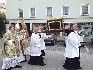 Der heilige Adalbero (+ 1090) ist der Gründer des Stiftes Lambach und hier auch begraben. Der Regen machte beim Fest pünktlich Pause und die Sonne schien wie bestellt zur Prozession. In seiner Ansprache betonte der Festgast, Propst Markus Grasl aus dem Stift Reichersberg, die Notwendigkeit der persönlichen Begegnung in den Beziehungen. Diese wurden dann auch noch bei der anschließenden Agape gepflegt.