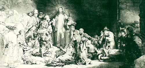 Das Drama zwischen Licht und Finsternis. Es ist nicht genau geklärt, welche Szene hier dargestellt ist; am wahrscheinlichsten ist die Annahme, dass hier mehrere Handlungen verbunden sind. Jesus erscheint in der Haltung des Predigers, er scheint mit den Figuren vor ihm in einem Streitgespräch zu sein. Gleichzeitig deuten die zahlreichen Krüppel und bittenden Gesten auf sein Wunderwirken. Schließlich weisen die Ruhe und Offenheit auf Momente des Segnens. Das gesamte Wirken Jesu scheint in einem Blatt komprimiert und wird als ein Drama zwischen Licht und Finsternis gedeutet. Inmitten des einfachen Lebens lässt Rembrandt das Ungewöhnliche in Erscheinung treten.