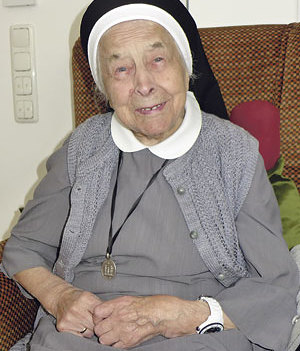 Ihre ewige Profess 1941 musste sie sich regelrecht erkämpfen, erzählt sie: „Ich habe mich aber durchgesetzt.“ „Die Hartnäckigkeit ist ihr geblieben, aber im guten Sinn“, ergänzen ihre Mitschwestern lächelnd. Nach dem Krieg unterrichtete Sr. Elmara hauptsächlich Religion, aber auch Hauswirtschaft bis 1976. Dann war sie weiterhin in den Häusern des Ordens tätig. Heute fällt es ihr manchmal schwer zu glauben, dass sie nicht mehr arbeiten kann: „Ich muss doch was tun.“ Arbeiten kann sie nicht mehr, sie hat aber Zeiten, in denen sie voller Leben ist. Als die Schwestern mit dem Besucher nach dem Essen plaudernd das Speisezimmer verlassen wollen, ruft sie: „Das Beten nicht vergessen!“ – Gibt es für eine Ordensfrau eine wichtigere Arbeit, als zu beten und an das Gebet zu erinnern? Dieser Arbeit kommt die 102-jährige Sr. Elmara noch immer nach.
