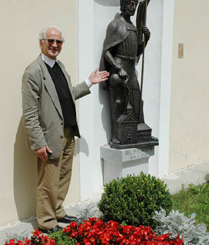 Zum Floriangedenkjahr 2004 ließ Pfarrer Franz Leitner (im Bild) von dem Künstler Peter Dimmel eine Florianstatue für den Hof des Pfarrhofs anfertigen. Die Metallplastik bildet mit dem barocken Fischbrunnen und den üppig blühenden Blumenbeeten ein prächtiges Ensemble.