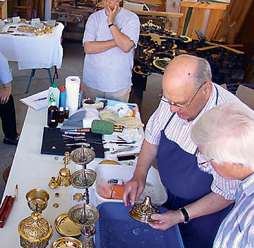 Kelche, Weihrauchfässer und Altarleuchter sorgen für besondere Festlichkeit in der Liturgie. Erst die fachkundige Pflege erzielt dabei den festlichen Glanz. Wie die Pflege von liturgischen Geräten funktioniert, kann man beim jährlich stattfindenden Praxistag des Kunstreferateder Diözese Linz erlernen. Dieser fand vor Kurzem zum Thema „Metall – liturgische Geräte und Schmiedeeisen“ statt. Kunstschmied Wolfgang Auer gab in seinem Atelier in St. Peter am Hart einen Einblick in den Umgang mit Gold und Eisen. Neben einem Fachvortrag zeigte Wolfgang Auer auch praktische Anwendungen, wie die richtige Technik des Zerlegens und Reinigens. Im zweiten Kursteil gab der Kunstschmied einen Einblick in alte Techniken und die Behandlung von Schmiedeeisen. Interessierte können sich für den Praxistag 2008 zum Thema „Metall“ (genauer Termin wird noch bekannt gegeben) bereits voranmelden.