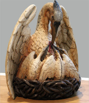 Es gibt aber auch Tiersymbole in der kirchlichen Bilderwelt, die nicht aus der Bibel stammen, zum Beispiel den Pelikan. Er ist in der Kunst wie das Lamm ein Symbol für Christus: In den Darstellungen öffnet sich ein Pelikan die Brust, um mit seinem Blut den Nachwuchs zu nähren – so wie Jesus sich für uns hingibt. Das Motiv kommt in der antiken Naturlehre Physiologus vor. Nur beruht es auf einem Irrtum: Der Pelikan füttert seine Jungen mit Futter aus dem Kehlkopfsack, nie aber mit seinem Blut aus der Brust.