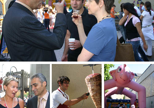 Foto oben: KirchenZeitungs-Solidaritätspreisträger 2007 Mag. Turan Ünal (links im Bild) beim interkulturellen Schulfest in der Linzer Goetheschule am 16. Juni 2007. Fotos unten: Die Muttersprachenlehrkräfte Mag. Malgorzata Szczerek (für Polnisch) und Mag. Turan Ünal (für Türkisch) beim Fest (links), köstliches Kebab (Mitte), und eine Hüpfburg, die alle Kinder anzog (rechts). Fotos: KIZ/Ernst Gansinger.