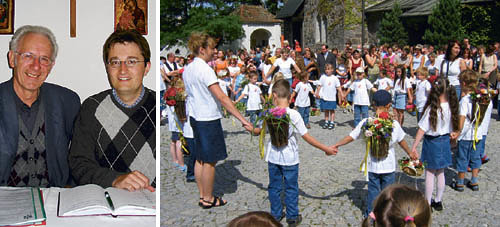 Linkes Bild: Pfarrer Thomas Lechner (rechts) mit seinem Vorgänger Johann Stöllnberger, der 32 Jahre Pfarrer in Schwertberg war. Rechtes Bild: Kindergartenkinder tanzen vor der Pfarrkirche.