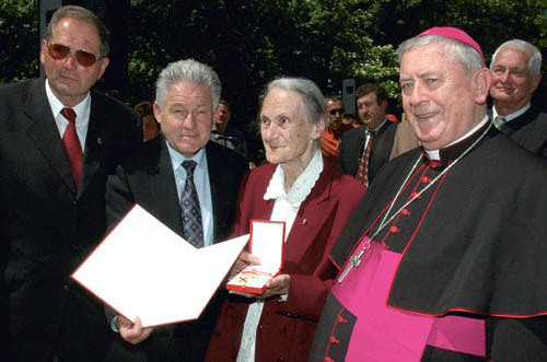 Goldenes Verdienstzeichen der Republik Österreich für Franziska Jägerstätter: Von links: Bürgermeister Isidor Hofbauer, Landeshauptmann Dr. Josef Pühringer, Franziska Jägerstätter, Bischof Dr. Ludwig Schwarz.