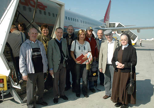 Am 23. April 2007 sind 183 Pilger/innen vom Flughafen Linz zur Diözesanwallfahrt nach Fatima aufgebrochen. Die von der KirchenZeitung und Moser Reisen organisierte Fahrt wird von Diözesanbischof Ludwig Schwarz begleitet. Zu den Pilgern gehören unter anderem KirchenZeitungs-Herausgeber Willi Vieböck (4. von links), Konrad Enzenhofer (3. v. li.), Pfarrer in Ottnang, und Josef Etzlsdorfer (2. v. re.), Pfarrer in St. Marienkirchen/Polsenz.
