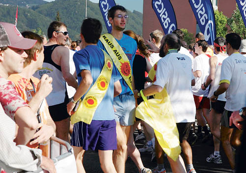 Der Salzburger Anti-AKW-Aktivist Jakob Neff lief den Viertelmarathon verkehrt, mit dem Rücken voran. Er wollte damit auf den Irrweg der Atom-Politik aufmerksam machen und mit der Richtungs-Symbolik zum Nachdenken anregen, dass die Gesellschaft in Sachen Atom den Retourgang einlegen müsse. Für die zehn Kilometer brauchte er etwa 56 Minuten. Das ist schneller, als Euorpa beim Atomausstieg ist. 70 Läufer/innen waren für Südwind am Start und trugen die Botschaft von Clean Clothes auf die Laufstrecke: Gefragt ist sportliche Fairness – auch für die Näherinnen von Sportartikeln in Fernost!