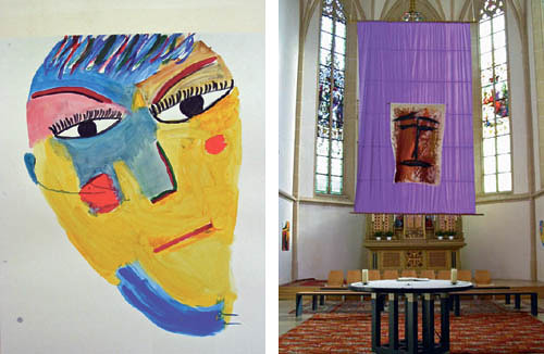 Ottensheim. Eine Bilderreihe überrascht in der Ottensheimer Pfarrkirche zur Fastenzeit. Schülerinnen der 3. und 4. Klasse der Hauptschule in Ottensheim haben gemeinsam die großformatigen Werke geschaffen. Thema der Bilder ist das menschliche Antlitz in seiner breiten Vielfalt. „Jeder Mensch in seiner Individualität hat seinen (Kreuz-) Weg und seine eigene Erscheinungsform des Gesichtes“, meint Kunsterzieher und Projektleiter Heinz Marischler. Das Großbildnis auf dem Fastentuch „Meditationen“ (Bild links oben) ist dem Künstler Alexej Jawlensky nachempfunden. In der Osternacht wird das Fastentuch entfernt, und es folgt ein weiteres großformatiges Antlitz in hellen, transparenten Farben – die Auferstehung.