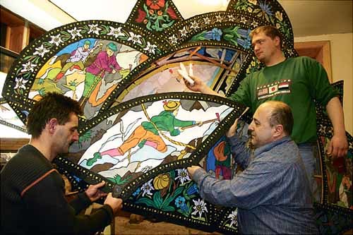 Glöcklerkappenbau Passe „Alt Kohlstatt“. Eine Glöcklerkappe besteht aus einem Holzgerüst, das mit schwarzem Tonpapier überzogen ist. Die Motive werden gestanzt oder geschnitten und mit Buntpapier aufwändig hinterklebt.