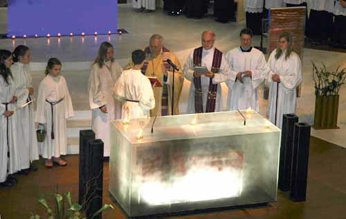 Näher zum Volk. Kurz war die Bauzeit, die im Sommer 2006 begann. Aber lange dauerte es davor, bis St. Konrad Raumverhältnisse bekam, die dem Liturgieverständnis des Konzils entsprechen. Es galt auch, die Wärme-, Akustik- und Lichtverhältnisse in der Kirche am Linzer Froschberg zu sanieren. Die Kirche wurde vor dem zweiten Vatikanischen Konzil gebaut (1959 bis 1961) und hatte damit die neuen liturgischen Richtlinien noch nicht berücksichtigt. Weit weg vom Volk feierte der Priester beim Altar die Messe. „Wir wollen wärmer, heller und kommunikativer feiern“, war die Vorgabe, die mit dem Engagement der Künstlerin Maria Moser hervorragend gelöst wurde (siehe dazu auch KirchenZeitung Nr. 48, Seite 8). Der Tisch des Wortes und der Tisch des Brotes sind näher an die Bankreihen gerückt. Pfarrer Dr. Walter Wimmer, der auch Vorsitzender des Priesterrates der Diözese Linz ist, sagt dazu: „Es geht in der Liturgie auch darum, einander Ansehen zu geben.“ Maria Moser gestaltete Altar, Taufbecken, Ambo, Sedes und ein Glasfenster „Auferstehung und Erlösung“ an der Südseite der Kirche. „Da hinten in der Ecke war es immer so finster“, sagte Bischof Aichern. „Durch das Fenster, das den Auferstandenen zeigt, ist es jetzt hell geworden.“ Erstmals arbeitete Moser mit Glas und hat in Zusammenarbeit mit Architekt Vinzenz Dreher und der Glaswerkstätte des Stiftes Schlierbach eine künstlerische Lösung umgesetzt, die nicht nur dem diözesanen Kunstreferenten Mag. Hubert Nitsch große Freude macht. Er betont eine wichtige Überlegung moderner Kirchenkunst in unserer Diözese: Im Sakralraum soll sich die oberösterreichische Künstlergeneration widerspiegeln.