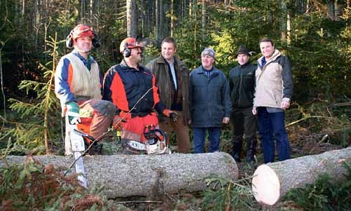 Im Bild u. a.: DI Mag. Johannes Wohlmacher, Forstmeister des Stiftes (3 v. l.) und Josef Geißler, KMB (rechts).
