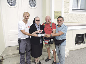 Mit dem Abfahrtsweltmeister von 1974, David Zwilling (2. v. re.), ist derzeit eine kleine Pilgerschar auf einer Etappe des Jerusalemwegs ins Burgenland unterwegs. Kürzlich besuchte die Gruppe das Mutterhaus der Franziskanerinnen in Vöcklabruck. Dabei übergaben Zwilling, Johannes Aschauer und Otto Klär, die gemeinsam 2012 den Jerusalemweg begründeten, an Generaloberin Sr. Angelika Garstenauer einen eigens für die Franziskanerinnen kreierten Jerusalemweg-Stempel für die Pilgerpässe. Das Mutterhaus liegt am Jerusalem- und Jakobsweg.